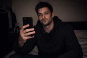 洗面所や部屋の鏡の前でスマホを持って撮る、いわゆる鏡越しの自撮り。